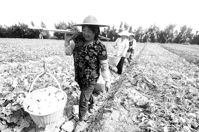 7月15日,温岭市滨海镇五百屿应岳林的塘地里,村民们正在收获黄金瓜。今年,该镇宁海村村民应岳林种植的20多亩黄金瓜,3个月前刚种下,就全部被上海客户订购,现在开始采摘,每亩净收入3000多元。 郑玲富 摄