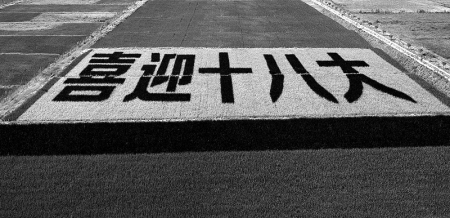 近日,在江山市峡口镇,一幅用紫色、黄绿色和草绿色三种不同颜色水稻组成的“喜迎十八大”彩色创意稻田图案格外吸引游客眼球,成为江山又一道独特靓丽的景观。 周展 摄