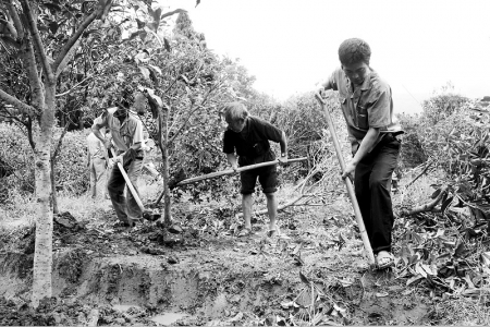 三门县海湾苗木场在该县小雄镇承包了110亩土地,种植了上万株苗木。11号强台风“海葵”过境,苗木场树龄超8年的2700余株树木被连根拔起,估计损失至少有30万元。图为种植户抢救被台风吹倒的桂花树,重新挖坑栽种。 朱曙光 摄