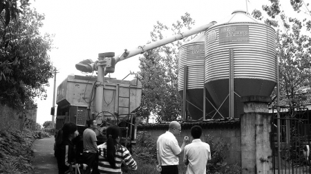 只用了短短9分钟时间,来自江山天蓬公司的散装饲料配送车就将5.1吨饲料干净利落地装入了该市贺村镇华塔村毛华斌猪场的料塔里。