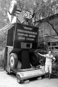 济南市历下区的刘庆博,从今年3月份开始和父亲一起联手打造一辆纯手工的“自动化变形金刚”,这个以悍马军车为原型的“变形金刚”不仅可以起立、卧倒,还能行走。刘庆博给他的机器人取了个名字“博派传奇”。 (摘自《燕赵都市报》 张爱杰/摄 2012年9月1日)