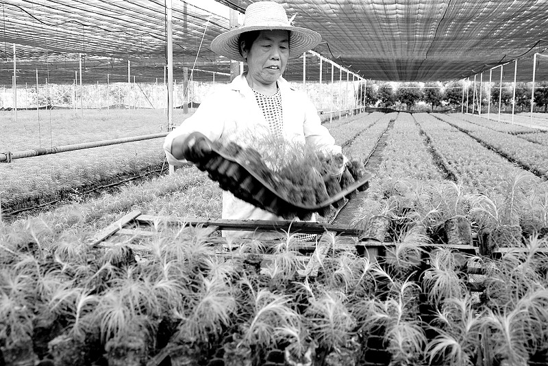前些日子,在建德市寿昌镇十八桥村的省珍贵树种容器苗培育基地,每天都有10多位工人在一座座钢架遮荫大棚内,给200多万株香椿、红豆杉、浙江楠、金钱松、黄檀等珍贵树苗进行分批移植、拔草、保湿等培育管理,力争在今年底投放各地苗木市场。王淑娟 摄
