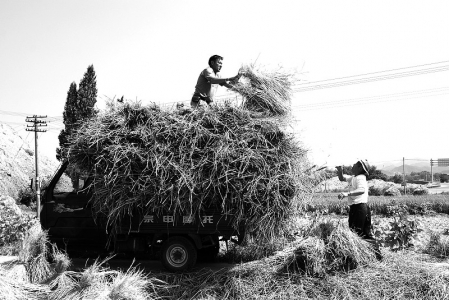 稻谷收割后,稻草就成了废弃物,一些农户将稻草遗弃在田里,甚至焚烧,影响了环境。建德市新安江街道新蓬村养牛大户黄富洪却视之为宝,将其作为他饲养的30多头黄牛的冬季饲料,垫圈后还是很好的有机肥。图为10月9日,黄富洪将无人问津的稻草装车运回家。 宁文武 摄