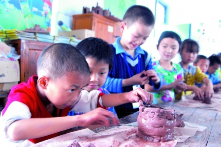 建德市马目中心学校今年起开办了陶艺班,让山村娃娃在“玩泥巴”中,了解陶艺制作。图为陶艺室里,孩子们正沉浸在陶艺制作的愉悦中。宁文武 摄