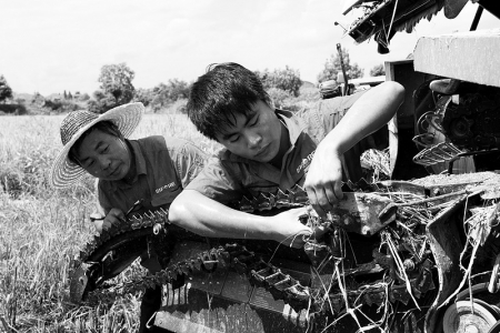农机技术人员下田头维修收割机。 俞胡斌 摄