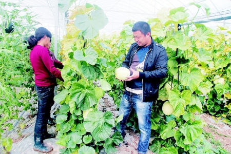 日前,笔者在衢州市衢江区莲花镇现代农业园区的林氏精品瓜果合作社的大棚里看到,今年刚从上海农科院引种的优质甜瓜喜获丰收。据合作社有关负责人方建国介绍,这一甜瓜品种亩产可达3500公斤,按目前每公斤20元来计算,除去各种开支,亩均利润可达3万元左右。图为管理人员正在查看甜瓜生长情况。 俞云龙 摄/文