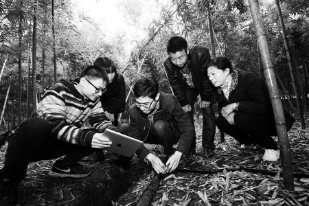 杭州笠翁笋业专业合作社的刘琦鑫(中)与徐又朋(左一)两位大学生社员在林间指导社员铺设安装水幕带。