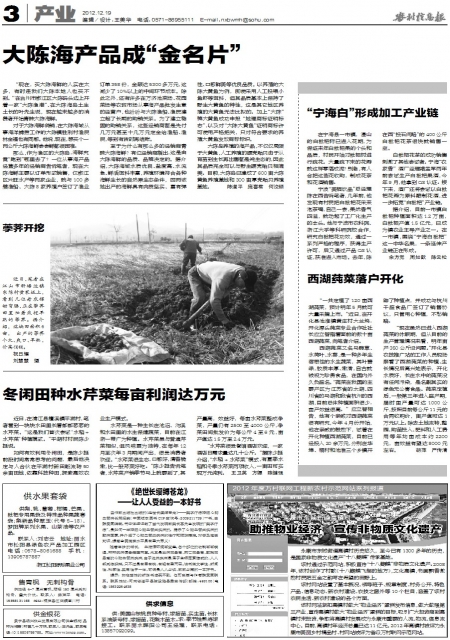 水芹菜是一种生长在池沼、沟溪和水田里的水生保健蔬菜,目前在江浙一带广为种植。水芹菜虽与普通芹菜相似,但风味更为独特,在每年12月至次年3月期间产出,很受消费者欢迎。“水芹菜很生态,口感好,清香脆嫩,比一般芹菜好吃。”陈少挺告诉笔者,水芹菜产销季节马上就要到了,其产量高,效益好,每亩水芹菜整成净菜,产量仍有2500至4000公斤,净菜田间批发价为每公斤4至6元,亩产值达1.5万至2.4万元。“水芹菜很受餐馆酒店欢迎,一家酒店日需求量达几十公斤。”据陈少挺介绍,“水稻+水芹菜”模式,有夏季水稻和冬季水芹菜两项收入,一亩田可实现万元纯利。 王卫英 方镖 陈健强