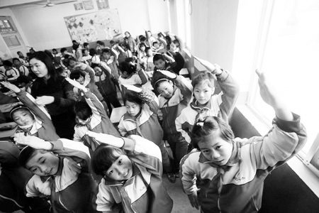 近日,山东济南工北二小教室里,老师带领孩子们在狭小的教室内做操。据悉,由于近日持续大雾天气,为防止学生户外活动吸入有害粉尘颗粒物,教育部门要求学校停止户外运动,在室内进行体育运动。