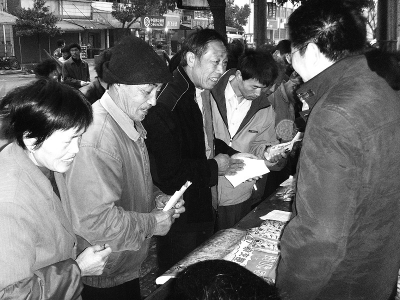 近日,绍兴县种子管理部门到农村开展“助农增收送服务”活动,图为农技人员在向农民推介新品种。 绍 总 摄