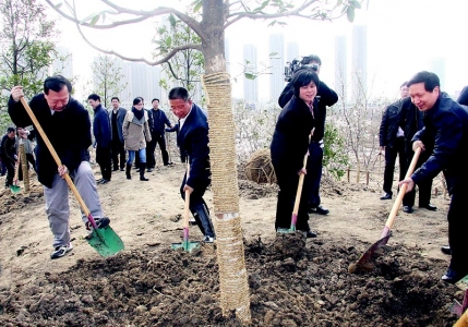 图为夏宝龙(前排左一)、赵一德(右一)、黄旭明(前排左二)等省领导在海宁市儿童乐园参加植树活动。