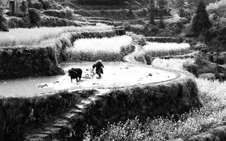 时下,武义县新宅镇大莱村的1900多亩梯田里,层层叠叠的油菜花、绿浪滚滚的小麦苗、洁白的萝卜花、白紫相间的豌豆花犹如一条条美丽的彩色玉带,农民在这七彩梯田中耕耘,宛如画中游。这活脱脱、原生态、现实版的农耕画卷,吸引了一拨又一拨都市游客前来观光。