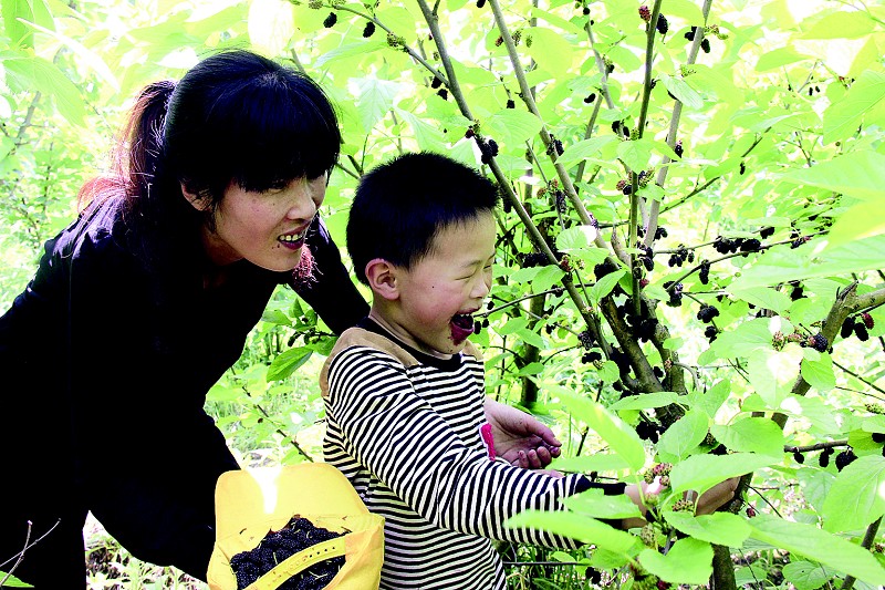乘着大好春光,游客们来到温岭市城东街道肖溪村的桑树基地采摘桑果,一颗颗紫红的桑椹十分诱人。