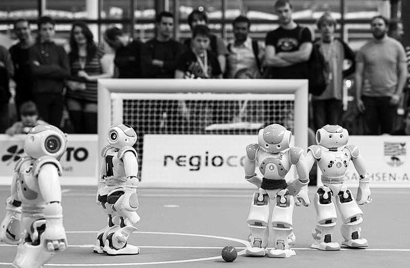 近日,在2013年德国机器人世界杯比赛现场,两支机器人足球队正在展开较量。本届世界杯吸引了来自14个国家的43支机器人世界杯大联盟球队,旨在展示踢球、救援和服务型机器人技术。