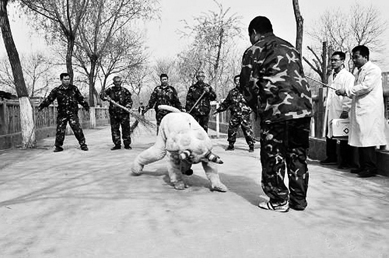 图为动物园工作人员在模拟动物跑出笼门,合力应对的情景。