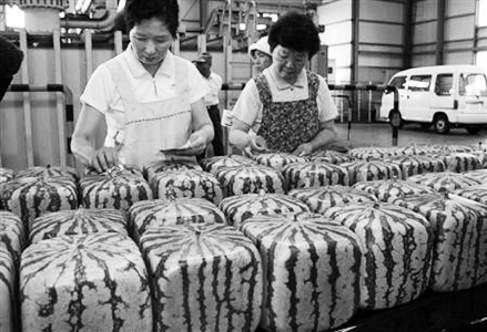 四四方方形状奇特的日本香川县特产“方形西瓜”近日在该县善通寺市的日本农协香川县笔冈集散中心开始出货。