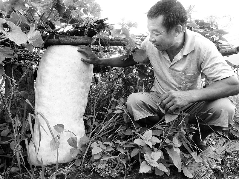 听说台州市黄岩区宁溪镇坦头村农民张文进种出了“冬瓜王”,7月22日笔者前去观赏,发现洁白的大冬瓜有 1米多高,六七十公斤重,还顶起了瓜棚。老张说这冬瓜还在长大,最近不打算采摘。虽然当地山区群众都种冬瓜,但这样大的冬瓜非常罕见。