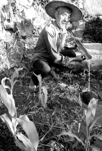 地处武义县南部山区的新宅镇大莱村,以种植高山蔬菜为主业,但从7月初开始遭遇了持续20多天35℃以上高温晴热天气,种植在梯田进入旺采期的1200多亩高山蔬菜大面积受旱。面对干旱,村蔬菜专业合作社组织菜农想方设法找水源,肩挑手提采用各种办法抗旱,尽量减少干旱造成的损失。7月25日,武义县气温高达40℃,菜农李陈贤用毛竹水槽引山泉水浇灌甜玉米。