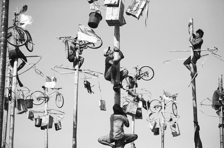 8月17日是印尼独立日,在印度尼西亚雅加达,有一项传统庆祝仪式是爬高。10米高的杆子被涂上厚厚的棕榈油,顶端放着奖品,从炊具、电视到自行车不一而足。 (摘自《新闻晨报》 2013年8月19日)