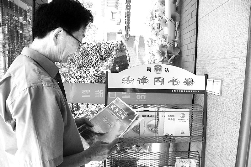 近日,在舟山普陀区朱家尖岛东荷嘉园望日度假客栈渔家乐门口,一位游客正在翻阅书架上的法律图书。据悉,在渔家乐设法律书架是普陀区开展普法教育的新举措,有利于业主和游客提高法律意识。