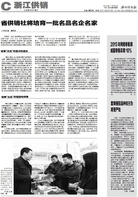 根据计划,到“十二五”末,在名品培育上,全省供销社系统力争新增中国驰名商标5件、浙江省著名商标90件、浙江名牌60件;在名企培育上,力争新增国家级龙头企业6家、省级龙头企业28家、浙江省知名商号10个;在名家培育上,力争培育30位在全国供销社系统及全省同类企业中具有较强影响力的优秀企业家。