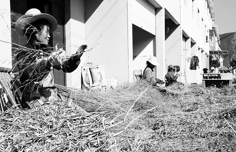 江山市峡口镇大峦口村许多下山搬迁到水香坂安置小区的村民,在家门口利用毛竹枝扎扫帚,增加经济收入。 祝日耀 摄