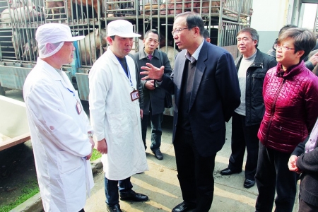 1月28日,省农业厅党组书记、厅长史济锡前往嘉兴,走访了海宁市群大畜牧养殖有限公司、乍嘉苏高速公路嘉兴动物卫生监督检查站和海盐青莲食品股份有限公司,检查指导H7N9禽流感防控和生猪屠宰检疫、“瘦肉精”监管等工作措施落实情况。图为史济锡(前右二)正在向海盐县动物卫生监督所驻青莲公司检疫站的工作人员了解生猪屠宰检疫情况。