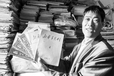 山东省枣庄市山亭区水泉镇粮套村47岁的农民于绍迎,30多年来,靠耕种二亩薄地、外出打工挣来的辛苦钱几乎全都买了书。他收藏的图书种类极其丰富,文史、名著、小人书、红宝书等应有尽有,还有大量的创刊号、明信片等,总数达到6.3万册。 (摘自《人民日报》 刘明祥/摄 2014年4月20日)