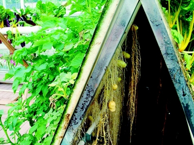近日,笔者见识了这种气耕栽培法。只见栽培设备中,几颗马铃薯正探出脑袋茁壮成长。该院科研人员赵根告诉笔者:“从栽种到现在有四十多天,成形的马铃薯已经有几颗了。”“气耕法栽培,就是将营养液雾化喷到植物的根部。”赵根继续说道,“运用气耕法栽培马铃薯,能提高单位面积产量,减少病害,避免连作障碍。”