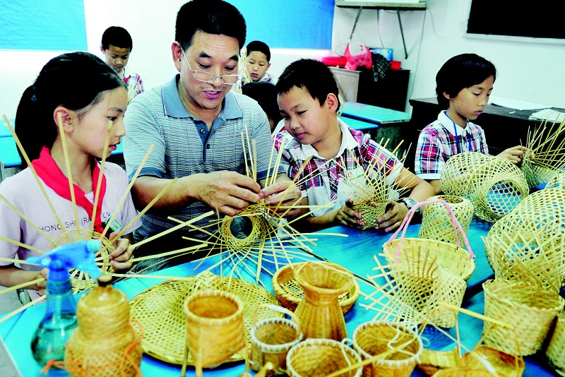 武义县古竹小学位于省级万亩竹产业基地——武义县大田乡。这里四周翠竹环抱,人均竹林面积1.24亩,毛竹是当地农民的主要经济来源。得天独厚的竹产业和竹文化,使古竹小学以竹命名,并与竹结下了不解之缘。图为武义县民间竹编大师何文良(左二)手把手教该校学生竹编技艺。 张建成 摄
