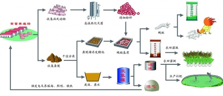 1.废液、粪水经厌氧发酵产生的沼气,供养殖场供热、照明、发电,沼液生化处理后用于农田灌溉、水产补肥等。