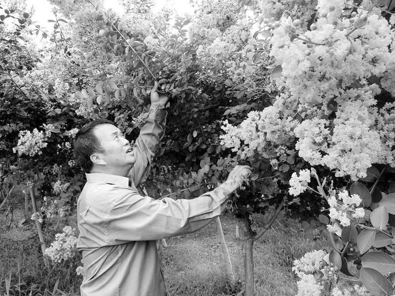 衢州市柯城区九华乡新宅村自去年底成为生猪禁养村后,村支部书记郑若古带头流转了90余亩土地,种起了桂花树、紫薇树、罗汉松、银杏、红豆杉等7000余株苗木。图为8月11日,郑若古正在苗圃精心疏理紫薇树。 魏丽 摄
