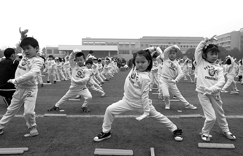 11月 7日上午,义乌二中操场上,南环幼儿园的350名小朋友参加“亲子同乐·健康运动”亲子趣味运动会。图为小朋友们秀出虎虎生威武术拳。