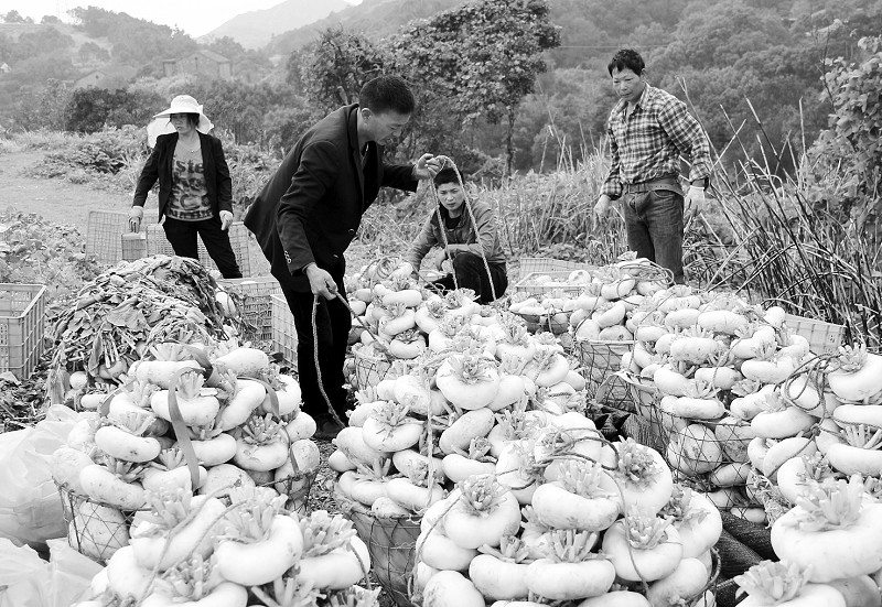近日,玉环县干江镇垟岭村村民林大德和妻子赵素芳正在收割盘菜。9月上旬种植的这6亩高山盘菜,预计亩产在2200公斤左右,产量挺不错。 吴达夫 摄