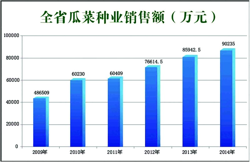 浙江省历年瓜菜产值、播种面积和种业产值全省瓜菜种业销售额(万元)全省瓜菜新品种推广面积(万亩)