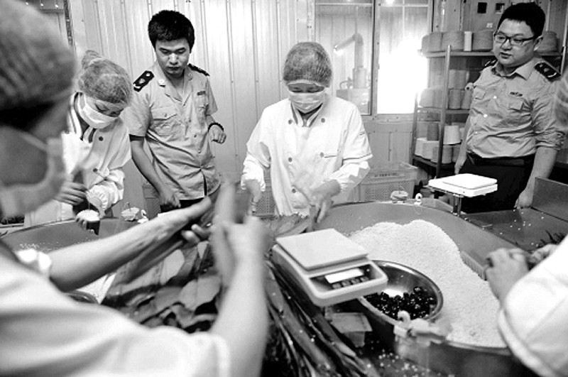 日前,嘉兴市秀洲区新塍镇市场监督管理所组织执法人员对辖区粽子生产企业开展专项检查,以确保端午节食品安全。 包呈杰 摄
