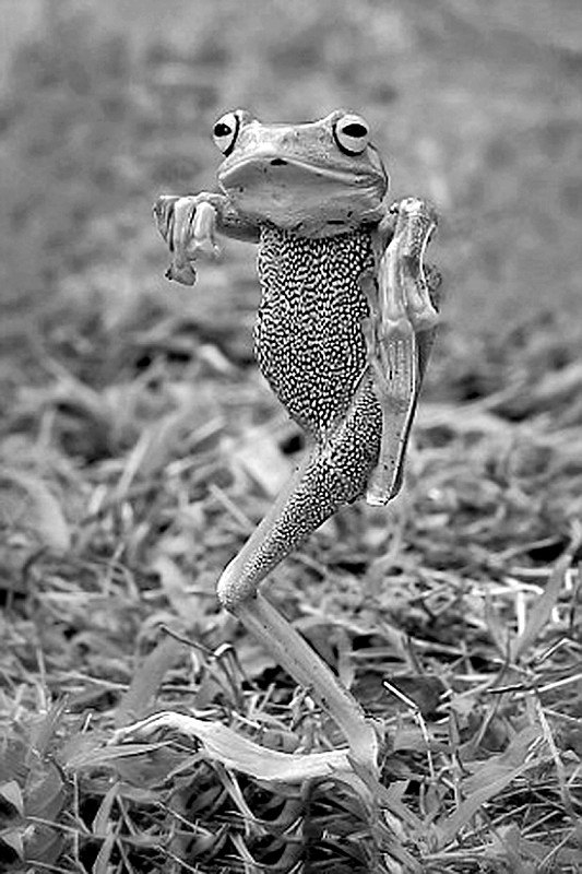 近日,42岁的印尼摄影师莫妮卡·阿纳犹瓦提在印尼爪哇岛东部任抹县抓拍到一只正“练习单腿站立”的树蛙,重现动作电影《龙威小子》中的经典场景。