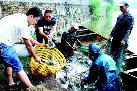 7月3日,建德市寿昌镇西门村养殖大户卢强新一早就组织人员在松山垄水库拉网捕鱼。随着水库周边环境整治力度的加大,水库水质变好,鱼类生长环境得到改善,产量提高,收入预计比去年增加两成左右。 宁文武 摄