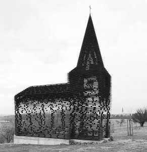 近日,比利时博尔赫隆市郊区出现一座引人注目的教堂,这座教堂远远看极为精美复杂,近看却只有一个框架。设计师为了建造这座教堂,动用了30吨钢铁和2000根短柱。钢板为短柱层层垒砌,短柱之间则距离不定,或远或近,交错迷离。