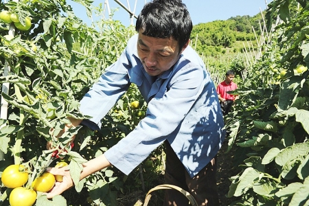 7月30日,临安市高虹镇大山村农民在采摘番茄。