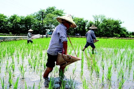 7月28日,龙游县红专种粮专业合作社农民给晚稻施肥。