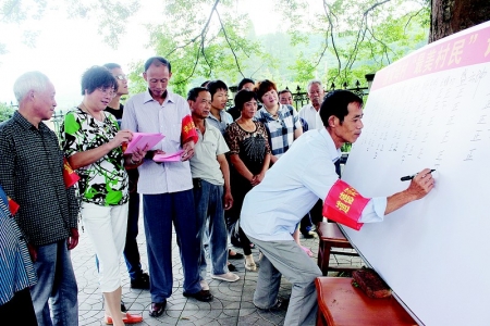 9月17日,湖州市吴兴区埭溪镇盛家坞村的村民道德评议会组织村民开展评选,评出了“创业致富美”、“助人为乐美”、“服务群众美”、“诚实守信美”、“孝老爱亲美”5个类型的10位“最美村民”。图为评选现场唱票。