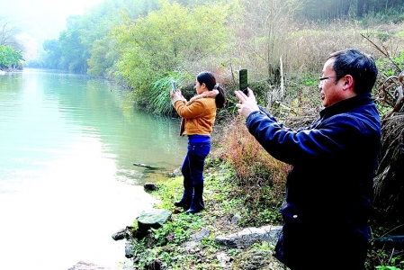 建德市新安江街道以“互联网+”为手段,为辖区内的7条河道建立档案,每周用手机拍下河道画面,并通过卫星定位软件传输到杭州水质平台。图为12月16日,巡查员正在对丰产村山河溪保洁情况进行拍照取样。 宁文武 王益坤 摄