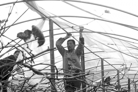 12月15日早上,玉环县干江镇干江村葡萄种植大户潘方云装着农膜和压膜的物资来到葡萄园。他说,据气象预报,近期一股冷空气正在南下,所以,雇了4个工人要给葡萄钢架覆盖农膜。“由于今年是年内春,季节有所提前,如再不抓紧覆盖,会影响明年的葡萄产量和上市时间。”潘方云说。 吴达夫 摄