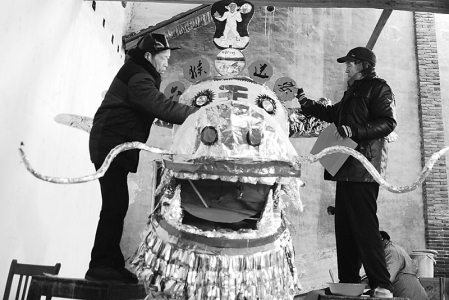 2月16日,建德市大同镇劳村村的能工巧匠正在编扎高4米、长6米、宽3米的巨型“龙头”。每逢元宵佳节,该村村民都要扎龙灯、闹元宵、庆丰年。 宁文武 摄