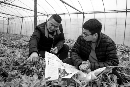 2月24日,在温岭市泽国肖氏家庭农场大棚里,26岁的“农创客”、农场主肖文铎(左)正在向来自玉环县的“农创客”褚剑波介绍冰草种植方法。 本报记者 叶敏 摄