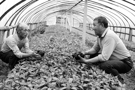 3月 20日,建德市新安江街道联塘村农民余寿龙(左)正在大棚里向村民讲解培育秧苗的种植技术。今年73岁的余寿龙在大棚里培育了辣椒、茄子、南瓜等优质瓜菜秧苗共5000多株,现已开始销售,每株售价在1-1.5 元 之间,预计一季菜秧可增收5000多元。