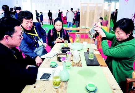 3月28日在武义县举行的金华市万人品茶大会吸引了金华及各地的120家茶企参加。图为茶艺师在品茶大会上为客人泡茶。