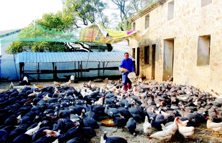 与老伴商量后决定搞养殖。去年3月,他花3万元从福建引进了1200多只珍珠鸡和600只高兰灰蛋鸡。“引进珍珠鸡主要是因为当地一般养的都是土鸡、三黄鸡,我就想养些别人没有养过的品种来增加效益。”黄根灵说,这种鸡很少生病也抗寒,吃的都是稻谷、杂粮,且珍珠鸡肉胆固醇含量比较低,营养价值比一般的鸡来得高。