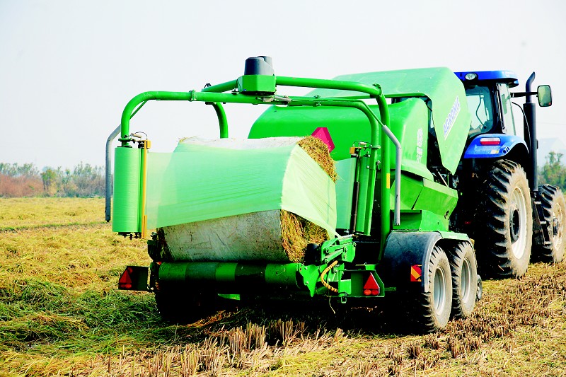 2.晚稻机收后,在田间秸秆上喷洒菌种、糖蜜,用秸秆打捆包膜机械,进行收集打捆包膜,运到贮存地点进行贮存,可以贮存1-2年。